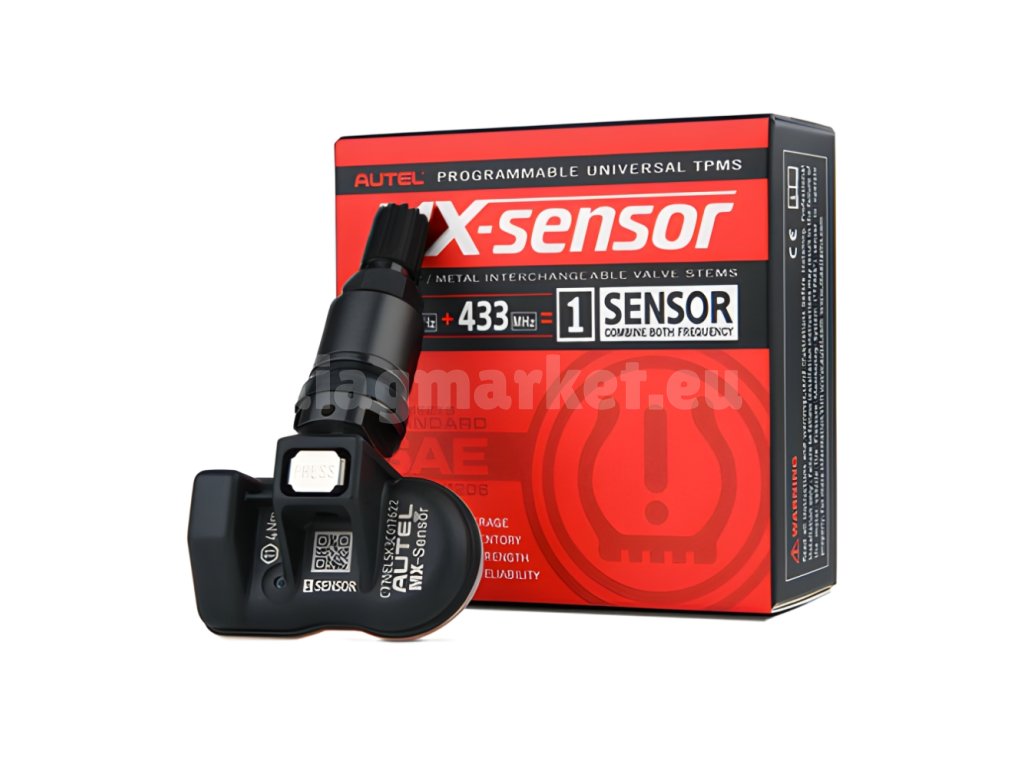 Universal TPMS sensor from Autel MX sensor for frequencies 433 and 315 MHz. Includes valve in black metal design.